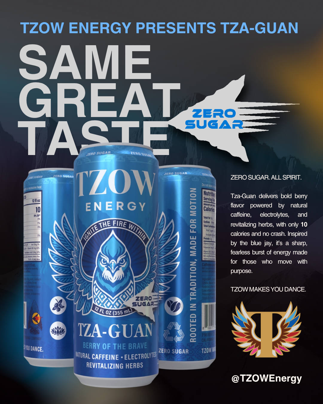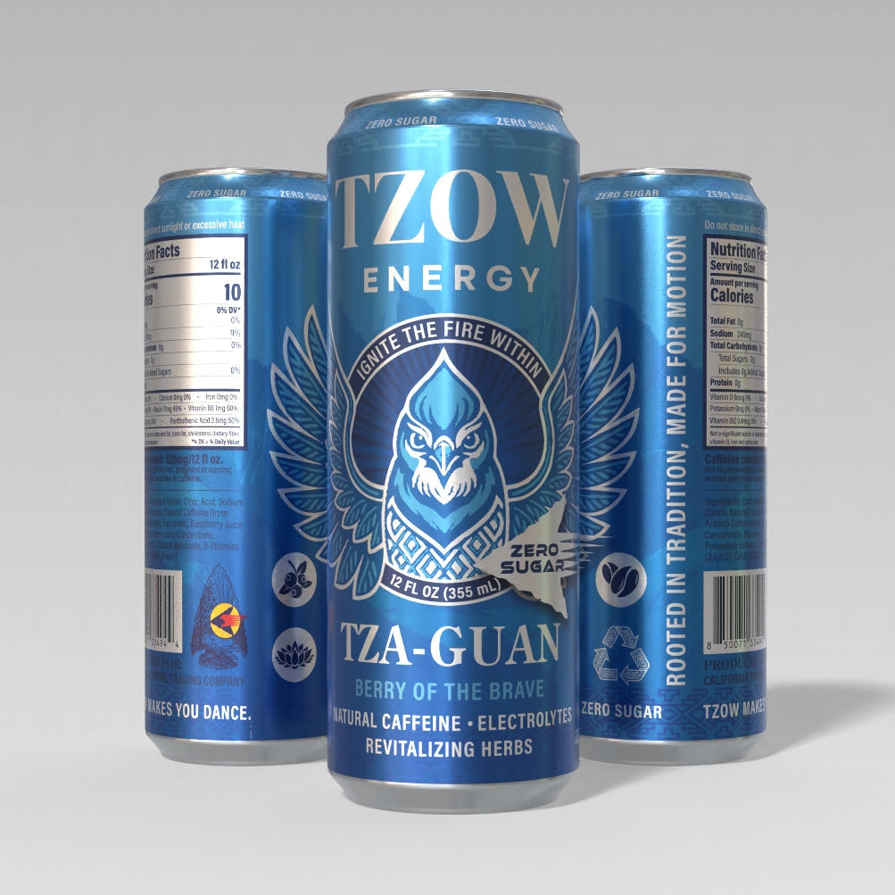 After extensive conversations with tribe leaders, we grounded the brand in their native language, cultural symbols, and artistic expression. The typography on TZOW Energy cans blends tradition and clarity through a thoughtful mix of serif and sans-serif fonts. The bold, custom serif, mirroring the “T” in the logo, is used for high-impact elements like the brand name, slogans, and flavor titles, evoking heritage and strength while honoring the visual rhythm of tribal lettering and storytelling. A complementary futuristic sans-serif font was introduced for the sugar-free line, giving those SKUs a cleaner, high-energy edge that communicates modern performance. Supporting details such as ingredients, descriptors, and nutritional information use a minimal sans-serif typeface for readability and balance, creating a clean hierarchy that feels both functional and expressive.